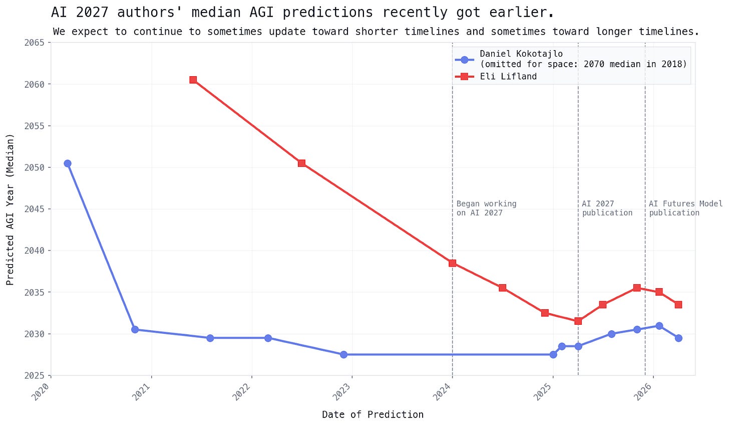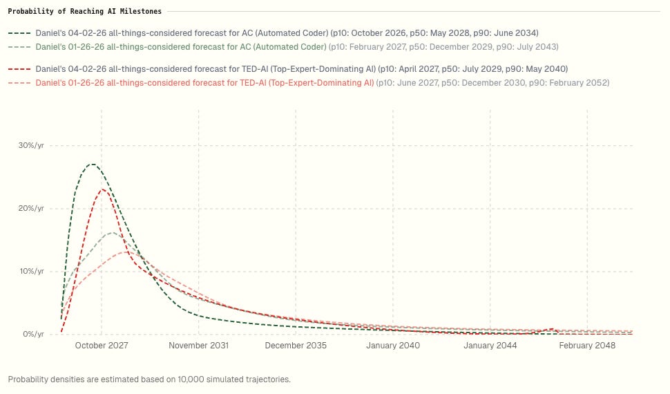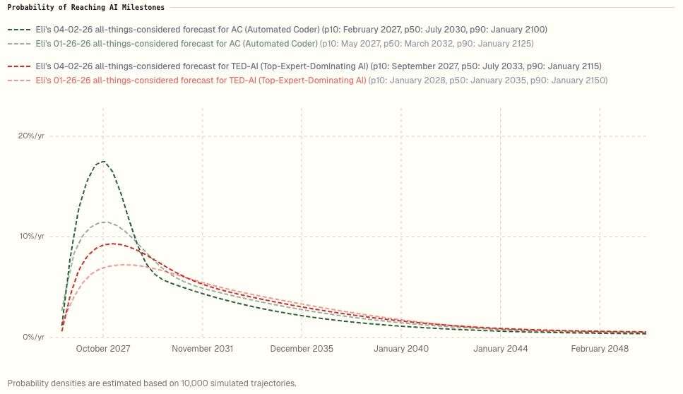 The bottom line result of our updates is to shift Daniel’s Automated Coder (AC) median from late 2029 to mid 2028, and to shift Eli’s from early 2032 to mid 2030.