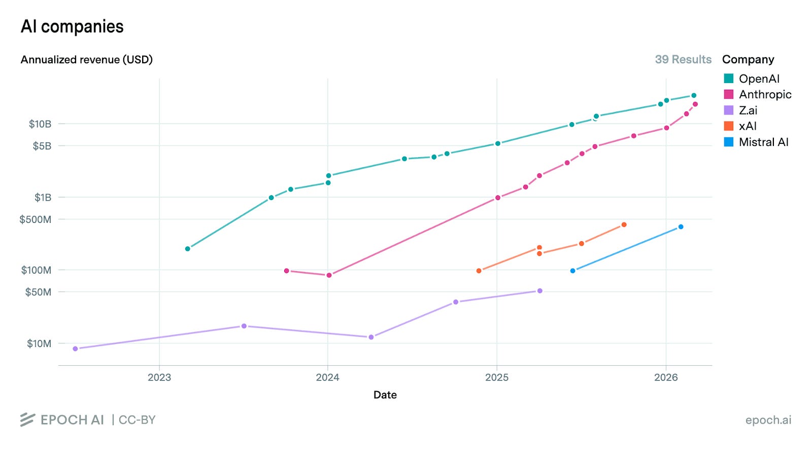 Meanwhile, in the real world, there may have been an even bigger shift; coding agents have exploded in usefulness and popularity. Claude Code reached an annualized revenue of over $2.5 billion in early February, just 9 months after its release. Anthropic’s trend of 10xing annualized revenue each year has continued into the $10B range.